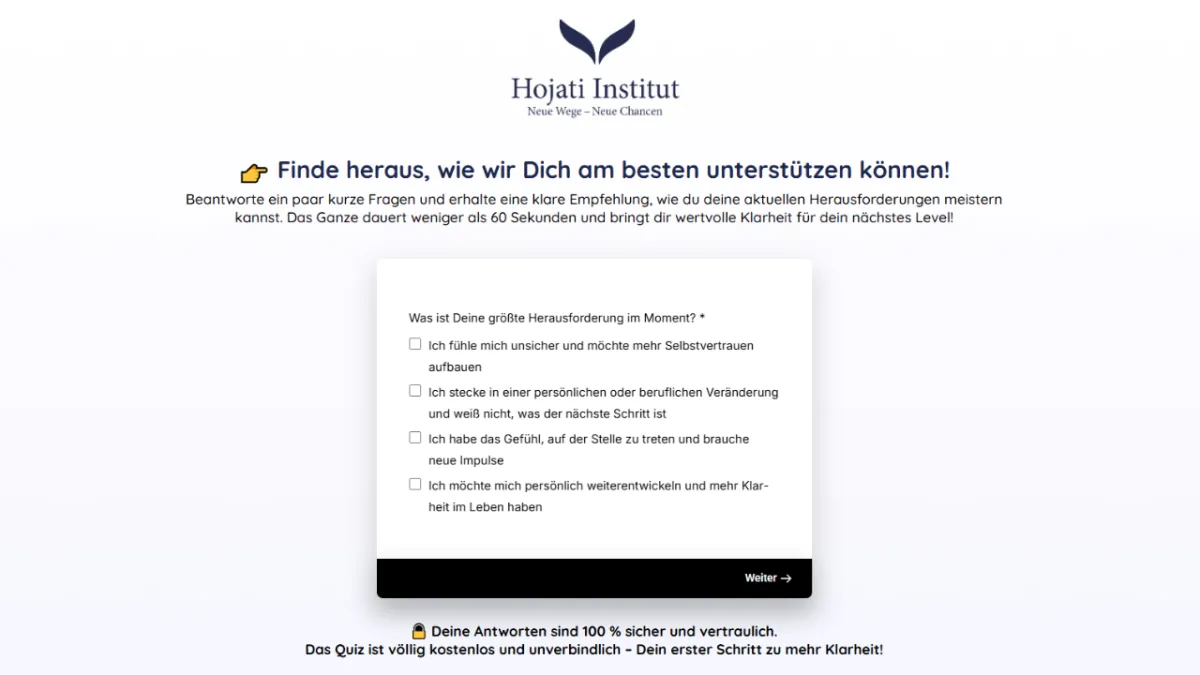 Mach mit bei unserem kurzen Fragebogen und entdecke, welcher Transformationsweg am besten zu Dir passt – Coaching, Seminare oder Ausbildung.